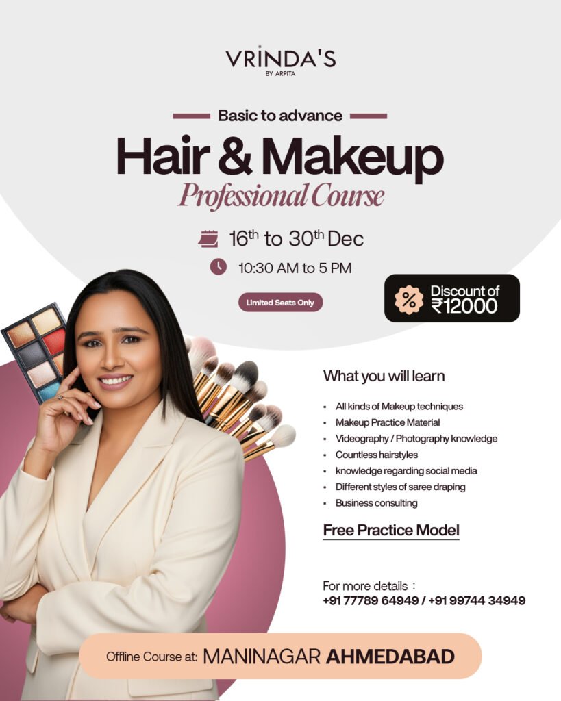 Become a certified makeup artist with Vrinda’s Beauty Academy in Ahmedabad, led by Arpita Desai. Learn bridal makeup, hairstyling & advanced beauty techniques with hands-on training.